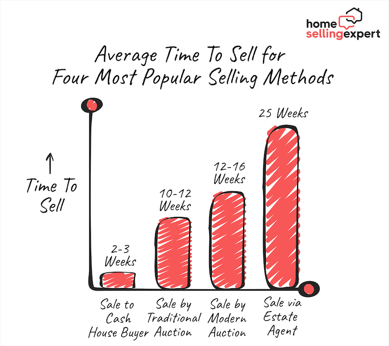 As you can see from the graph, selling your home directly to a house-buying company is the fastest way to sell your house. You can complete in as little as two weeks if you sell to a genuine, well-funded company!