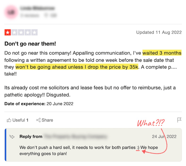 Don't make the mistake of thinking you can use online reviews to spot the goodies from the baddies either. You can't really trust online reviews for house-buying companies. As I'll outline below, online review-tampering is rife, meaning many of the worst companies seem to have great online reviews.